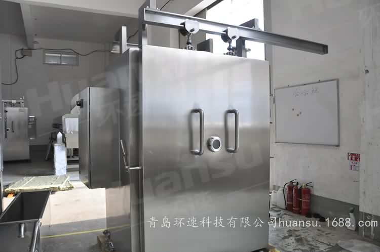 熟产品真空预冷机制造商详情依据-真空系统即抽气系统,由真空泵和管路组成,现场连接电源和管道后,通过PLC程序控制系统实现全自动化控制。制冷系统包括匹配的半封闭螺杆压缩机或活塞压缩机、冷凝器、蒸发器以及气分、油分、储液器和制冷管路等。真空预冷中,用水作为制冷剂。因为水的蒸发潜热大且不造成污染,满足环保的需求,是较为理想的制冷剂。真空预冷处理是运用了真空这一环境,通过降低水的沸点,使水汽化吸热,从而实现快速降温的技术。真空预冷机根据真空预冷的技术设计研发而成的快速冷却的先进设备。采用真空冷却技术能有效促使经高温加工后的熟肉制品在短时间内迅速降温,快速通过细菌容易繁殖温度带,从而延长储藏期,保证食品的营养。